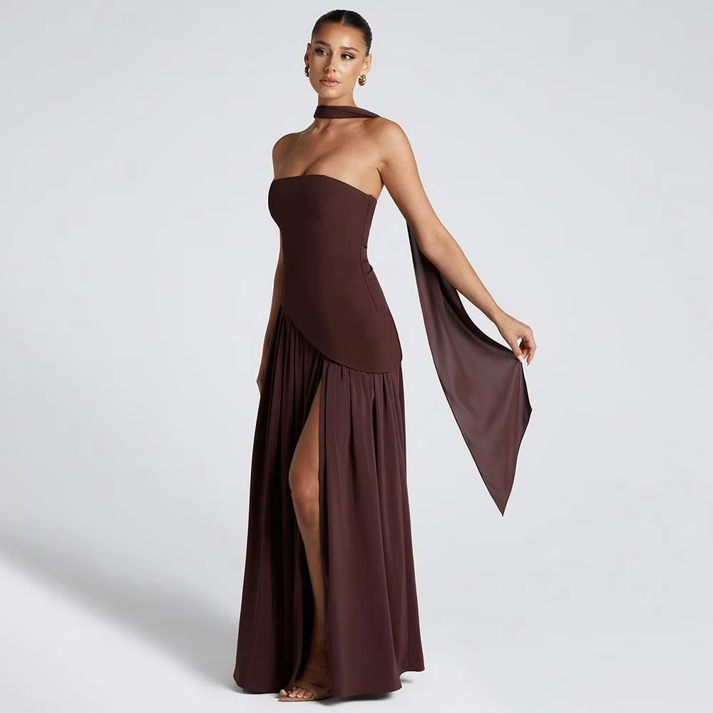 This brown maxi dress is a stunning gown crafted from smooth stretch satin. It features a structured, boned bodice, a cutout off-the-shoulder neckline and an elegant pleated collar with a tie-back for the perfect cinching. The flowing train and skirt add to the drama.